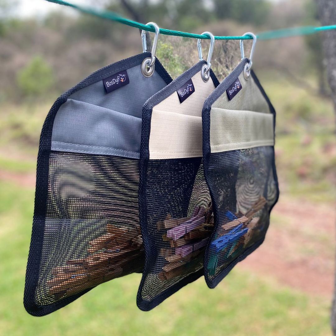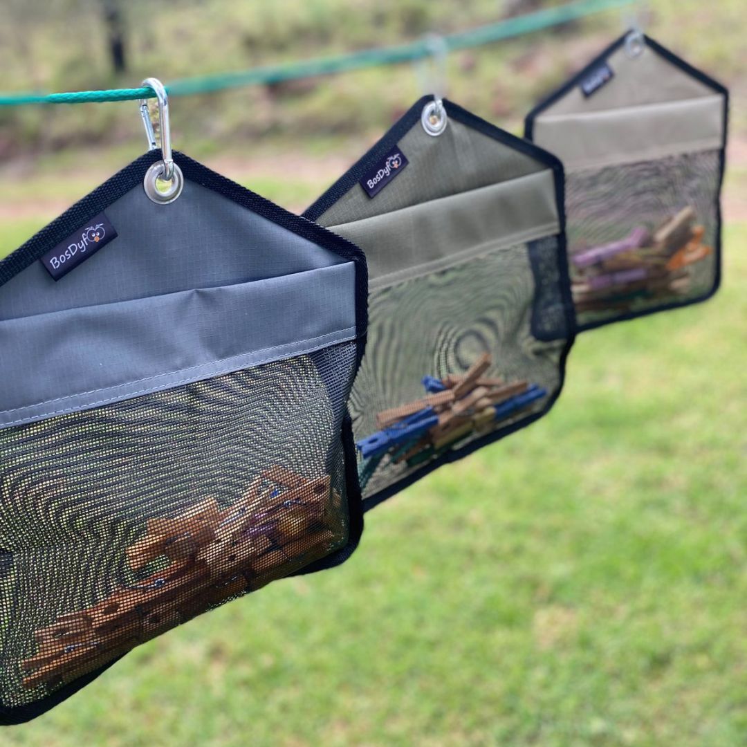The Bosdyf Peg Bag is a practical and reliable accessory for organizing and storing clothes pegs and can be ordered with or without 20 pegs and 10m rope.