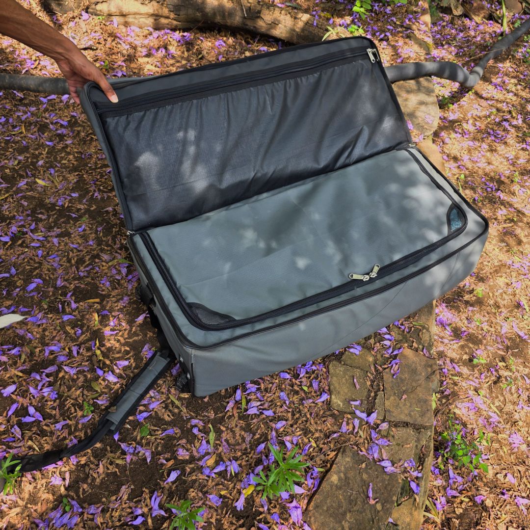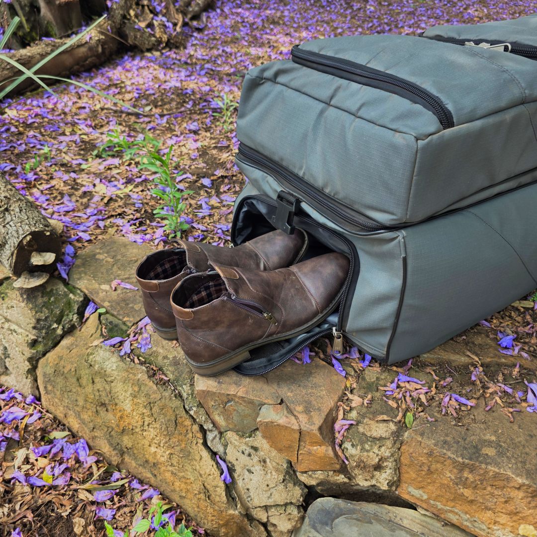 The bag includes four compartments. A side shoe compartment keeps your shoes separate from clean clothes, comfortably fitting a large pair of boots. The top zippered compartment holds small items like chargers, a tablet, documents, or a book. Another compartment accommodates more than a week’s worth of underwear, socks, shorts, and T-shirts. The bottom compartment is large and spacious, perfect for pants and shirts. Each compartment has its own zipper and they stack on top of one another, ensuring everything stays neat and tidy.