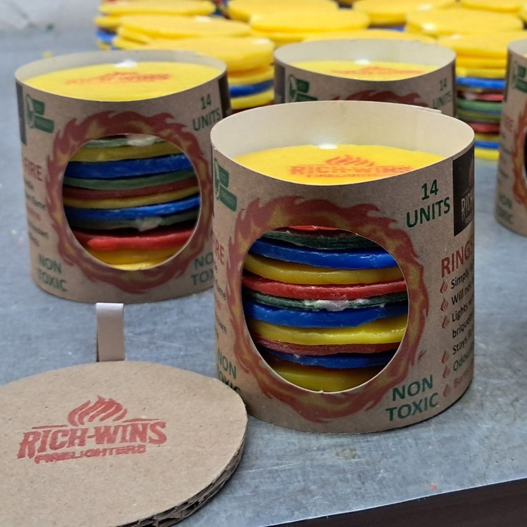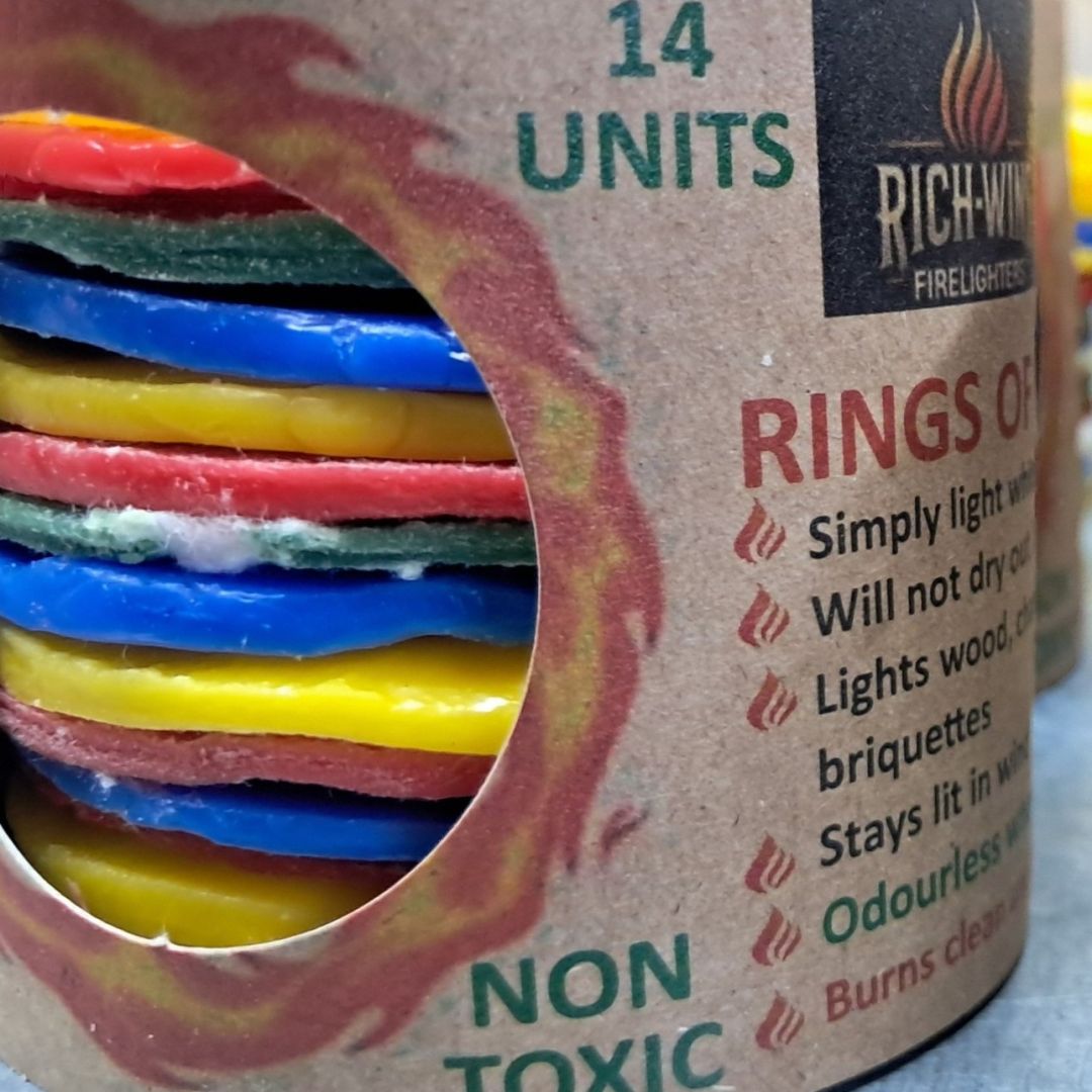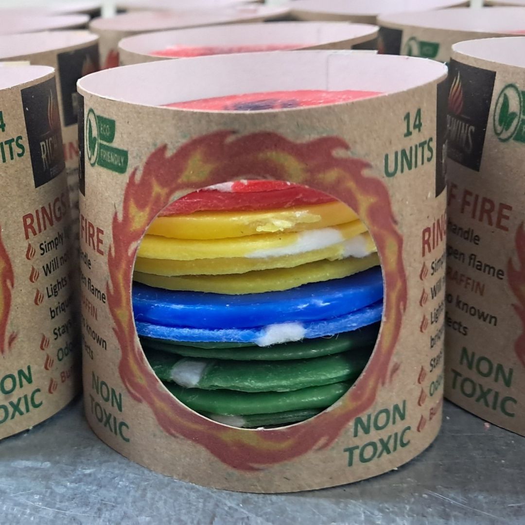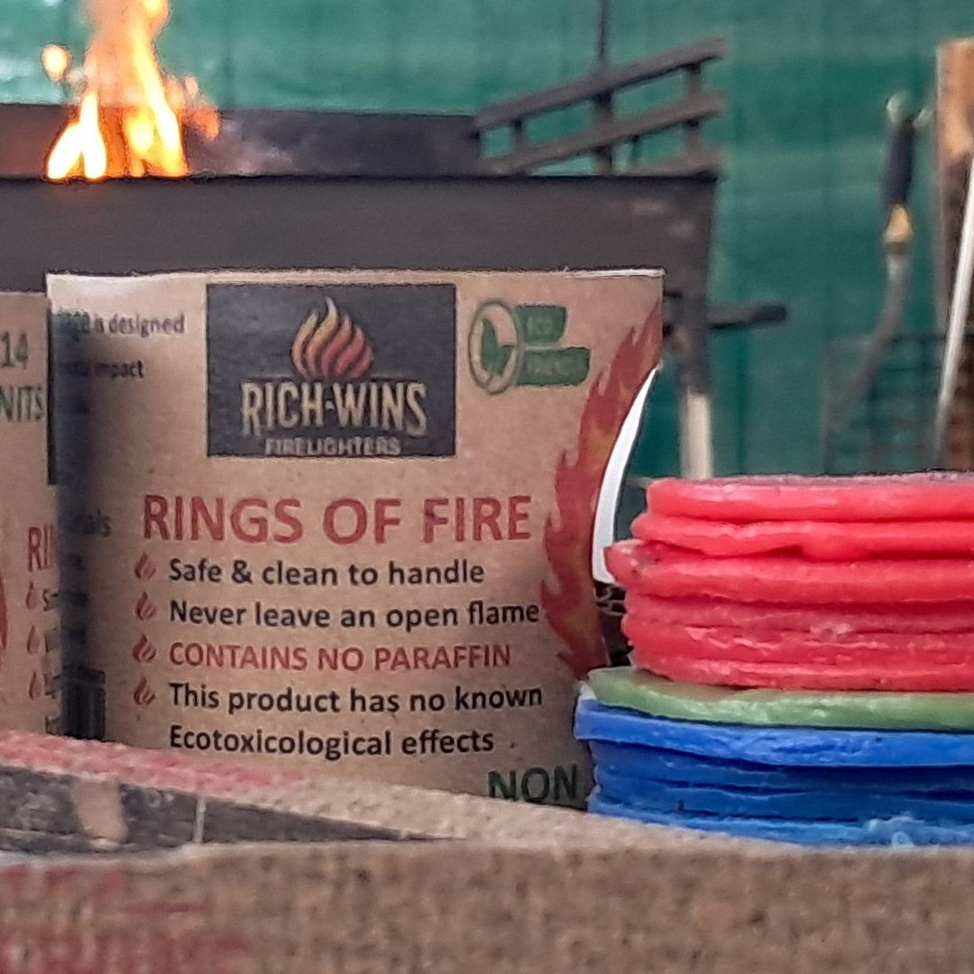 Rings of Fire are round wax coated cotton discs that are water resistant, odourless, clean burning firelighters, containing no parafin.